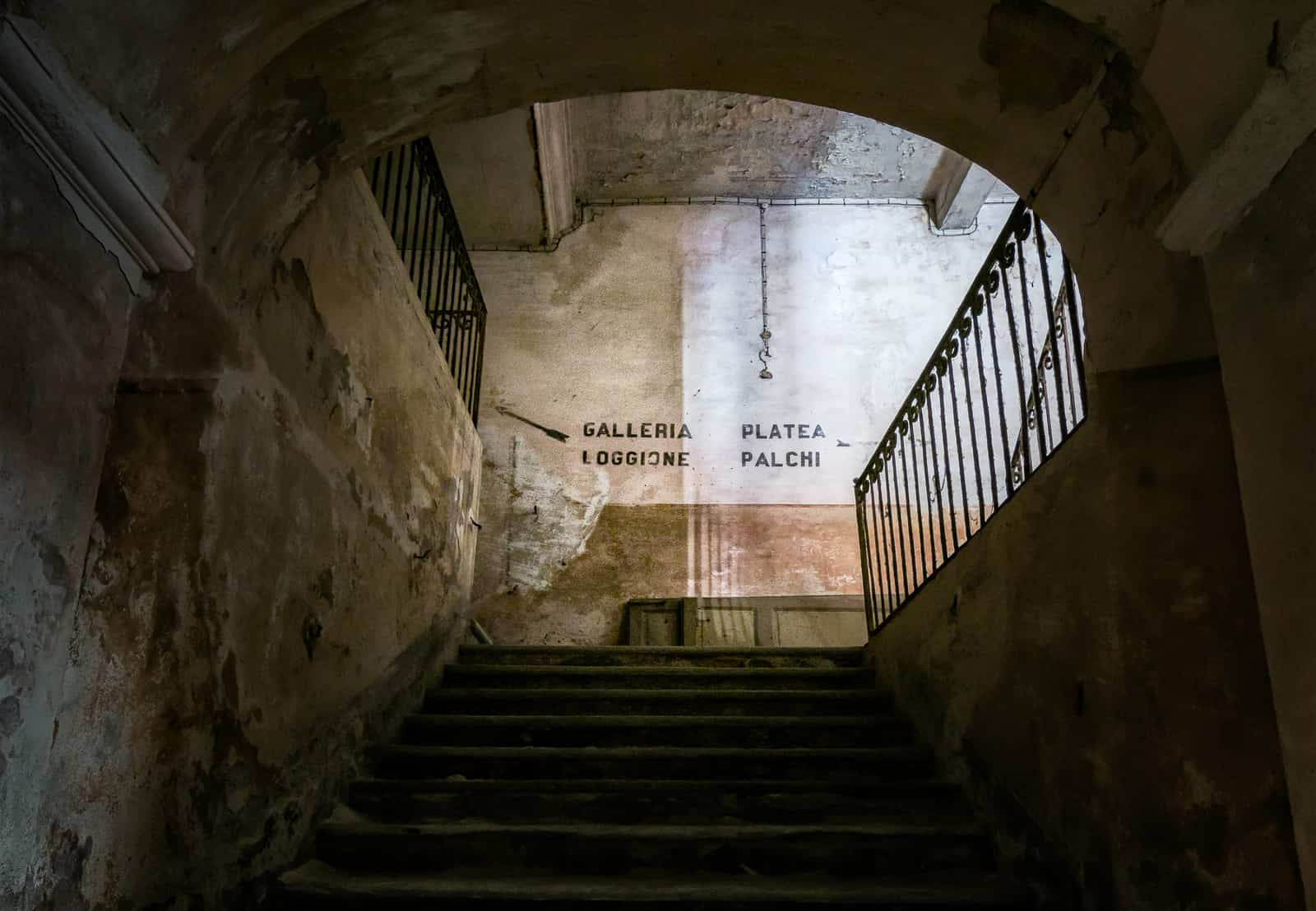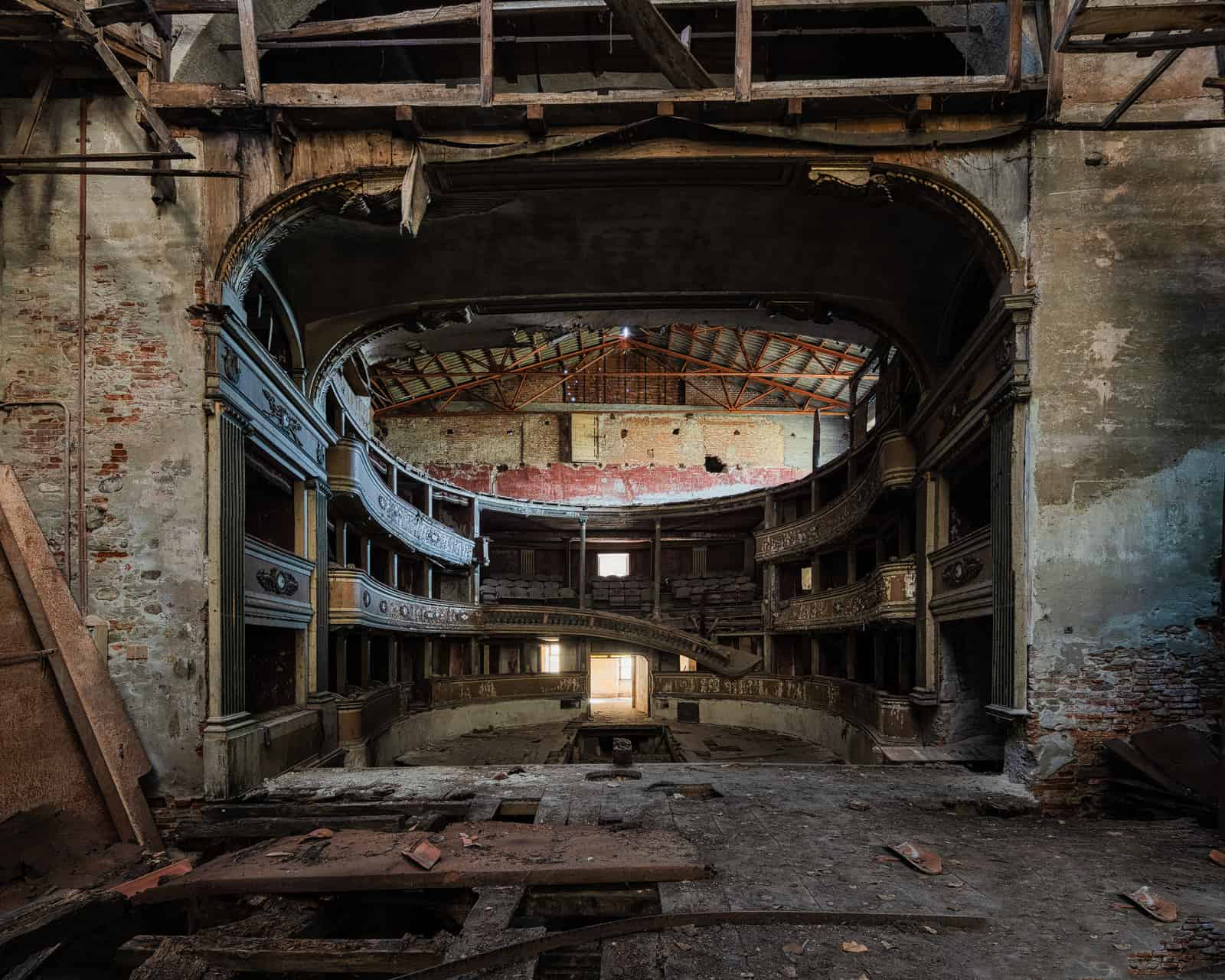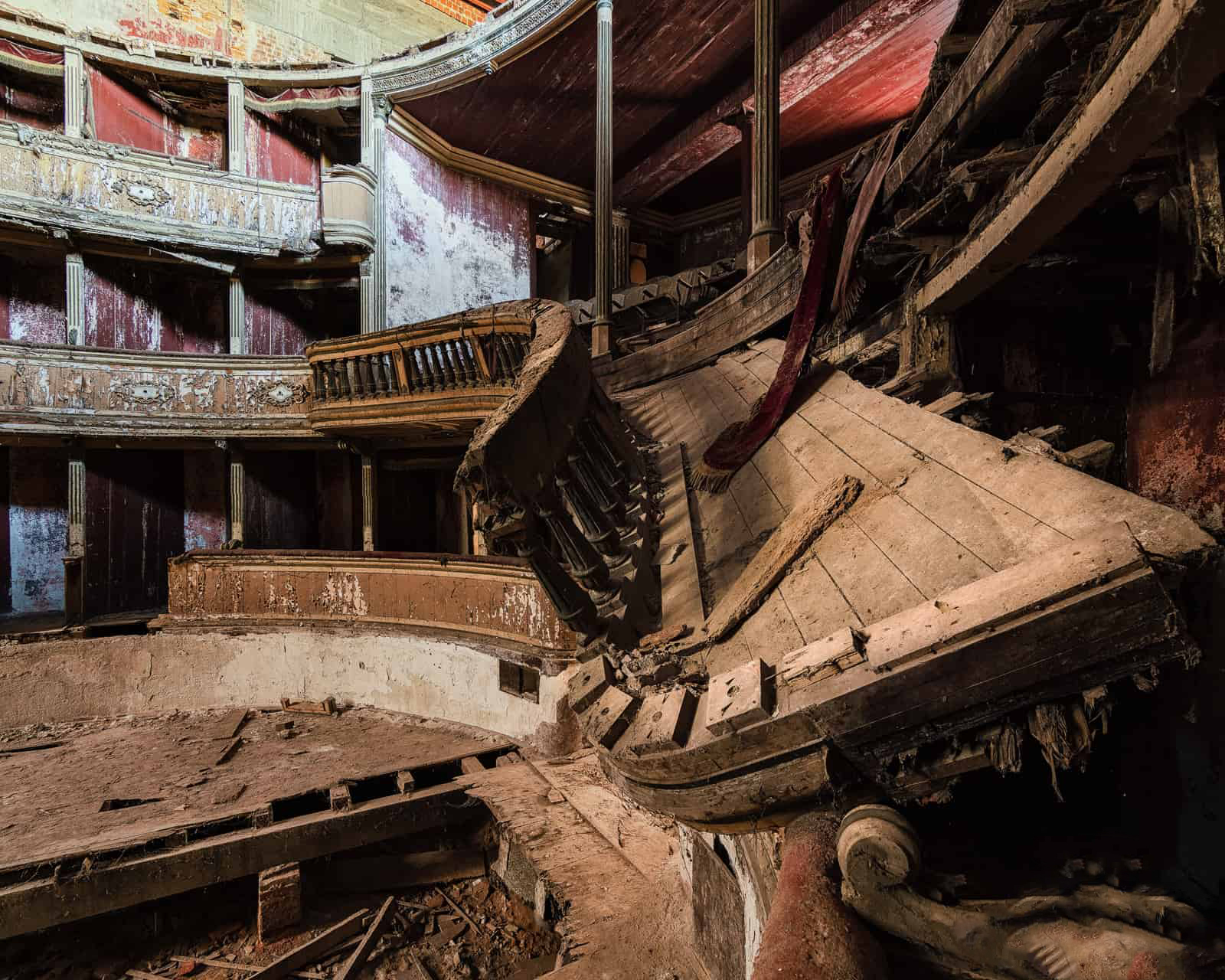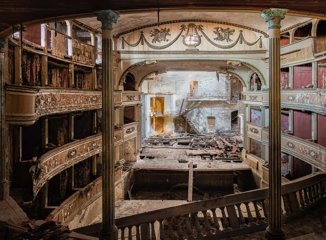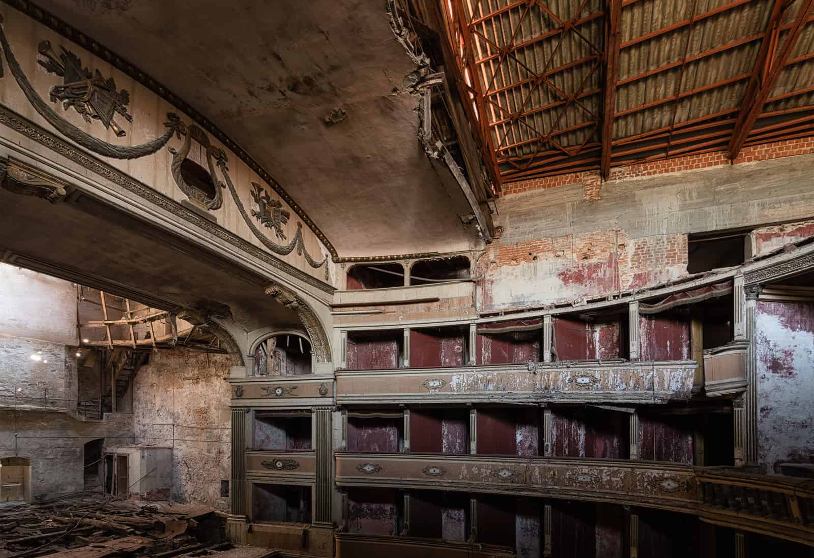 Si può ancora notare un grande palcoscenico in legno con un imponente arco di proscenio, decorato con modanature in gesso dipinte d’oro. Il palco si sta scheggiando e sta crollando ed è pericolosi camminarci sopra.